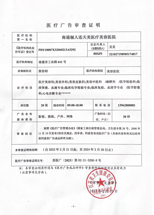 南通儷人連天美醫(yī)療美容醫(yī)院是與著名的醫(yī)療美容集團(tuán)合作建立的醫(yī)院,醫(yī)院提供高品質(zhì)的醫(yī)療美容服務(wù)。2008年,南通儷人連天美醫(yī)療美容醫(yī)院落戶南通,成為由南通衛(wèi)生局審批的專業(yè)醫(yī)療美容醫(yī)院。南通儷人連天美醫(yī)療美容醫(yī)院,特別設(shè)有專業(yè)的整形美容科、皮膚美容科和微創(chuàng)美容科三大科室,致力于為廣大求美者提供全方位的醫(yī)療美容服務(wù)。南通儷人連天美醫(yī)療美容醫(yī)院為求美者建立個(gè)人終生美麗檔案,一對(duì)一進(jìn)行細(xì)致服務(wù)。 11年來(lái),南通儷人連天美醫(yī)療美容醫(yī)院,不斷引進(jìn)先進(jìn)設(shè)備,不斷完善醫(yī)美技術(shù),一批優(yōu)秀、專業(yè)而穩(wěn)定的醫(yī)生團(tuán)隊(duì),為無(wú)數(shù)求美者鑄就美麗夢(mèng)想。